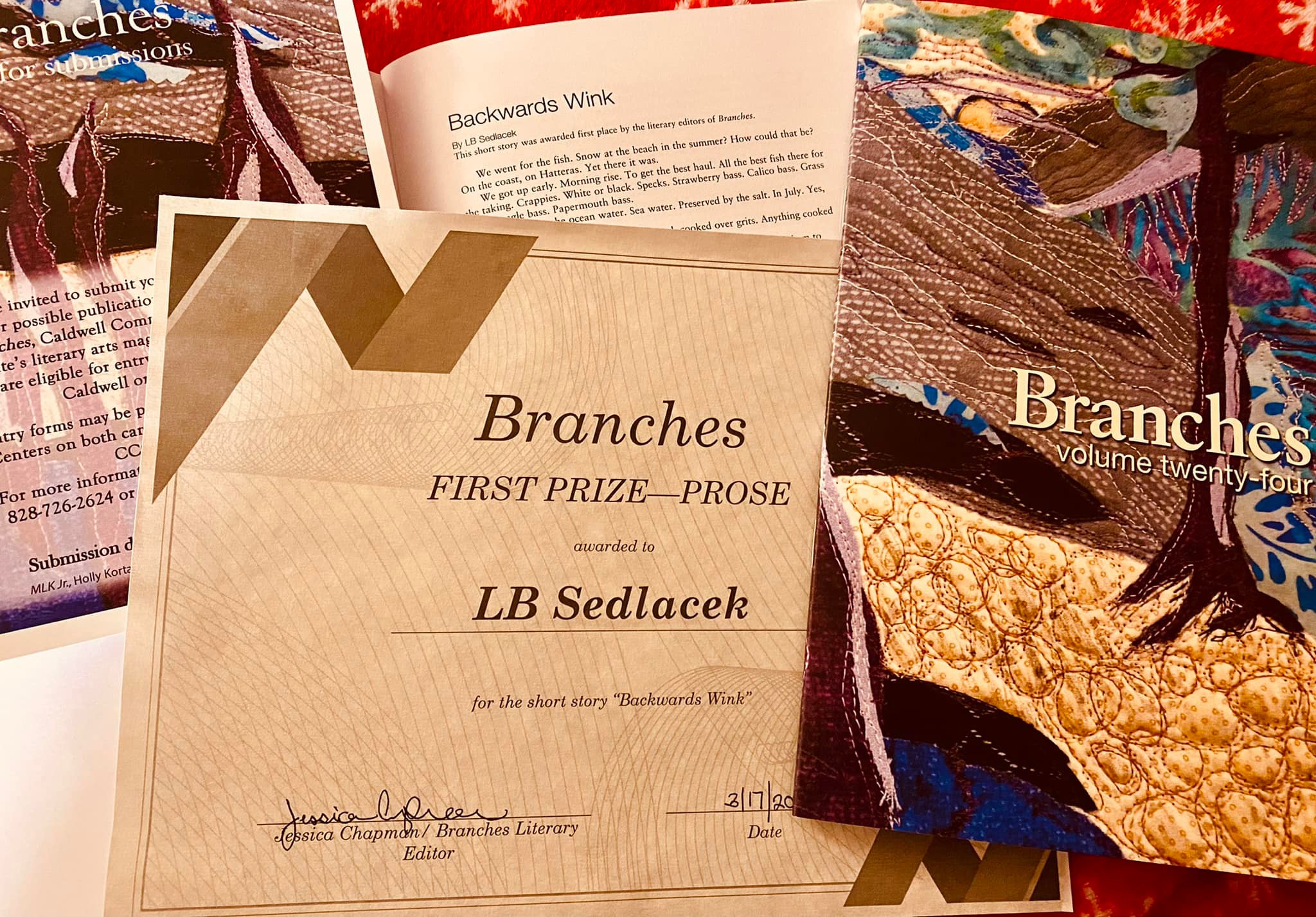 I’m so honored to have had my short story, “Backwards Wink,” chosen for First Prize in the new issue of “Branches” literary magazine. It is issue #24. I really love this story as it’s set where a lot of my fiction is: North Carolina. This one takes place on Hatteras!